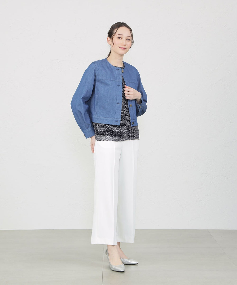 寒暖差が気になる季節もさらりと羽織れて、デニム素材のさわやかな色合いが若々しい印象に仕上げてくれるノーカラージャケット。