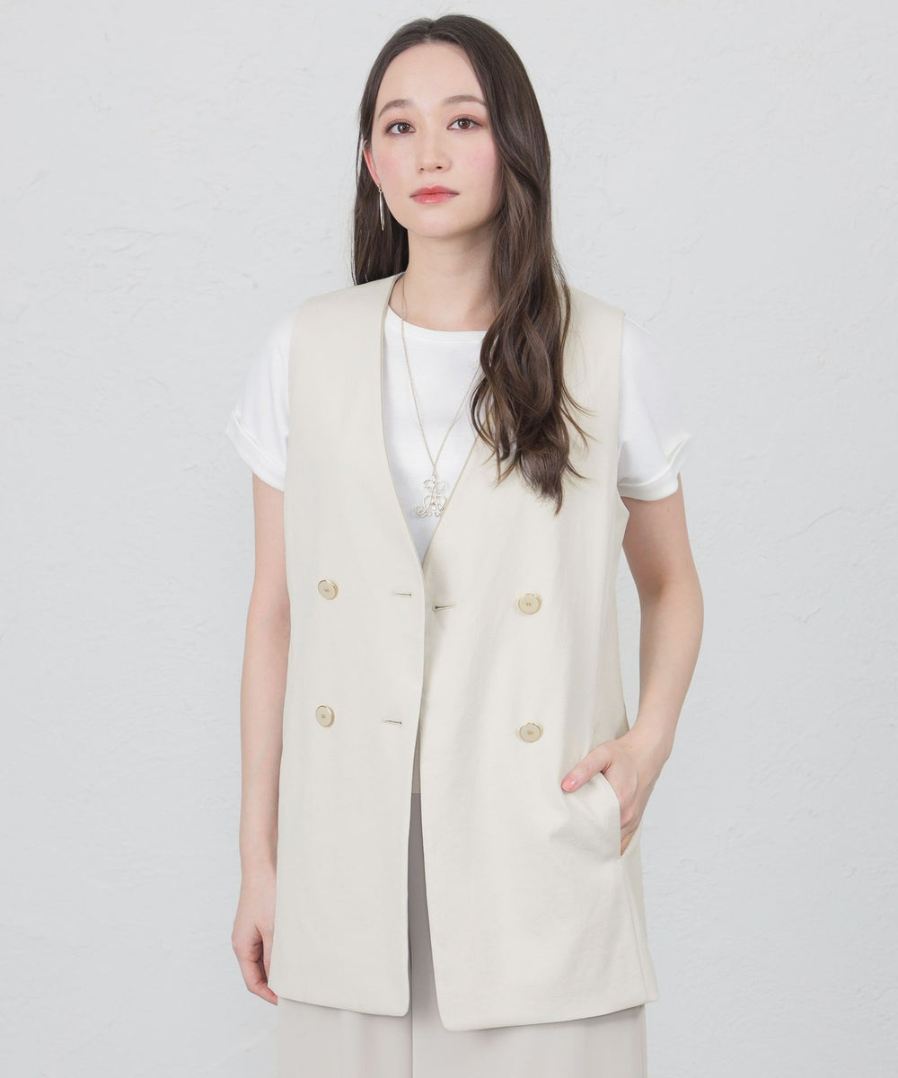 アウターを羽織るよりも軽やかですっきりした印象に見えるミドル丈のジレ。