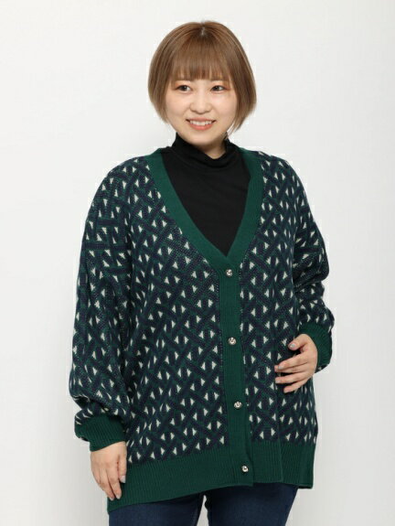コーデの主役になるようなジャカードのレトロなカーディガン。裾や袖の引き締め配色がアクセントになっており、すっきりでおしゃれな印象を与えられます。