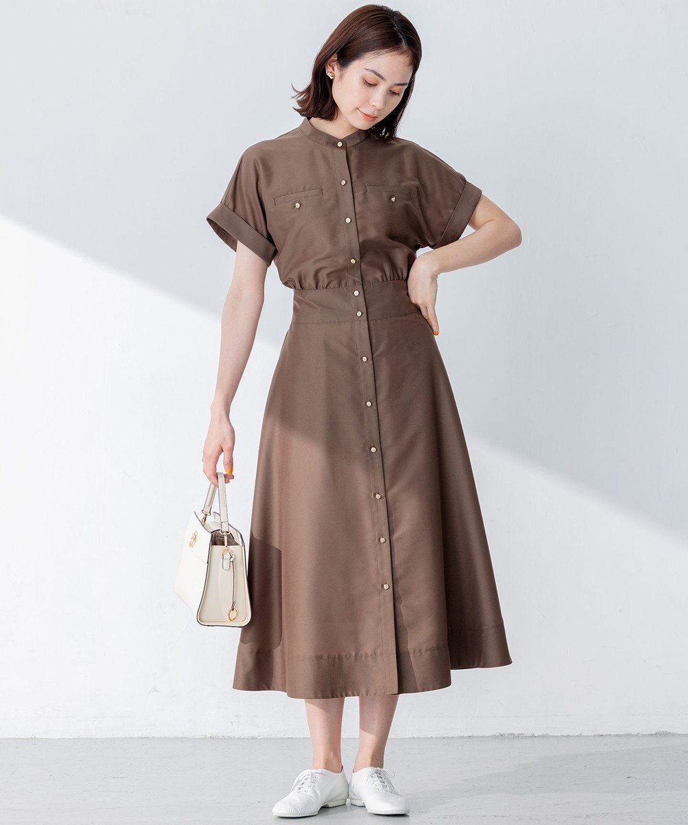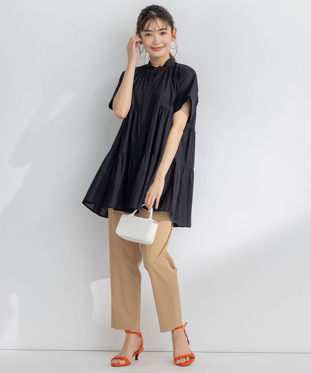 バンドカラーでややゆったりとしたシルエットですが、ウエストの切り替え部分は作ってくれつつ隠したい二の腕や腰回りをカバーしてくれるのが嬉しいポイント。