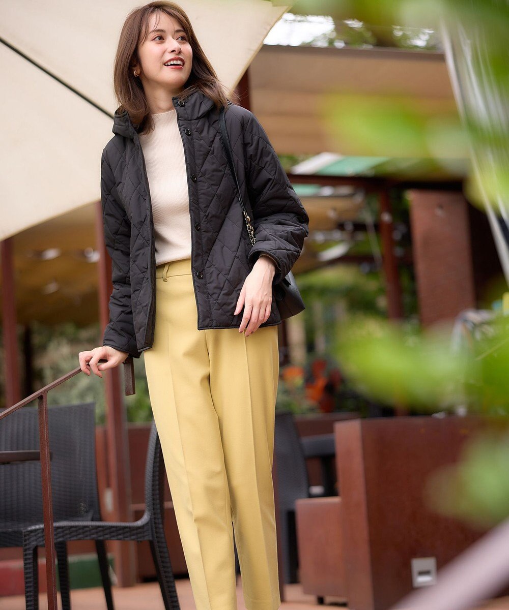程よくゆとりのあるカーディガンとストレッチパンツの組み合わせは、定番のリラックスコーデ。