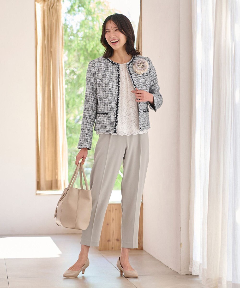 カラミツイードならではのやわらかな着心地のノーカラージャケットとタックを効かせたテーパードパンツ。どちらのアイテムもお家でのお手入れが可能で、プルオーバーの軽やかさとブラウスの上質さがマッチしています。コサージュやネックレスでセレモニースタイルに、ノンアクセではセレモニー以外の特別なイベントやビジネス時にもマルチに着こなすことができるでしょう。