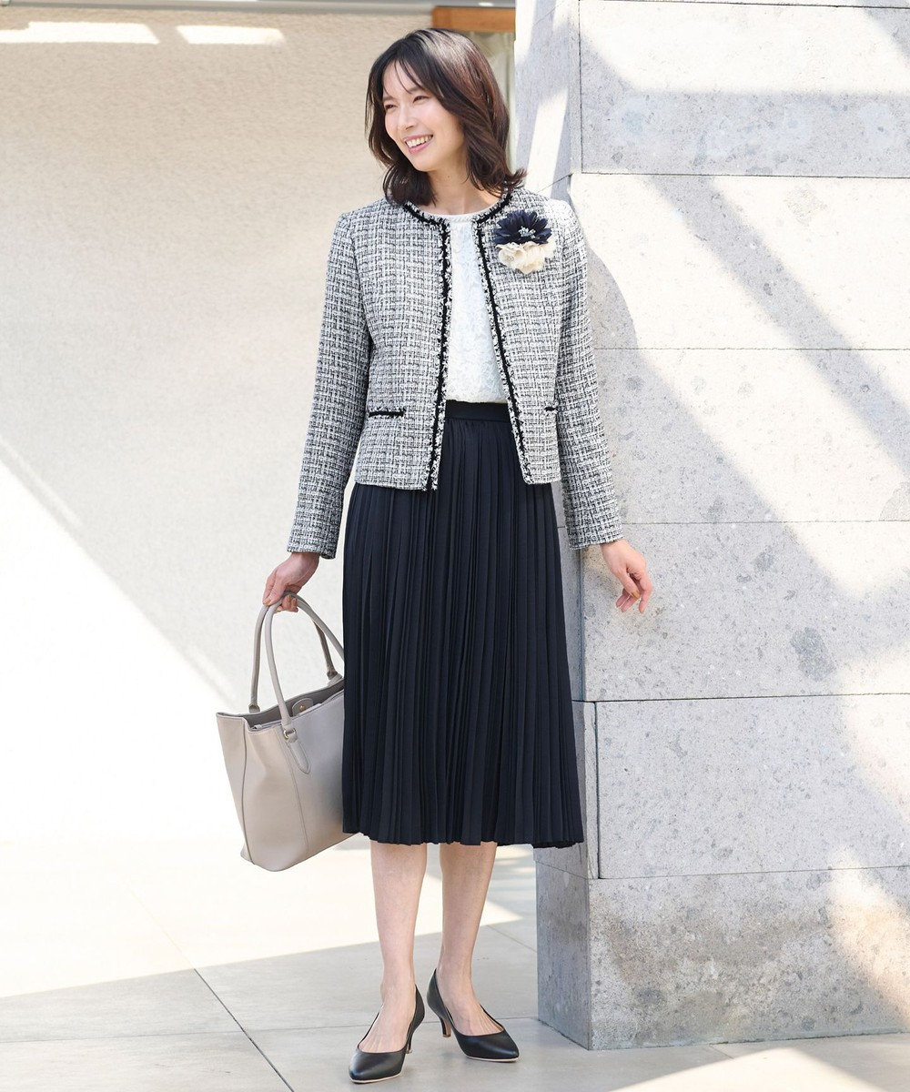 ファンシーツイードノーカラージャケットとスカートの組み合わせは、好みや子どもの服装に合わせて選べる、ブラック系とネイビー系のカラーを展開。同ブランドで購入できるふんわり系ブラウスを合わせることでメリハリのあるコーデに仕上がり、体型が気になる女性にもピッタリ。